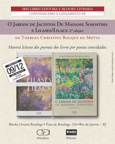 – DIA 09 DE DEZEMBRO, DAS 18h ÀS 21h, “LILASES/LILACS”, 2ª edição, e “O JARDIM DE JACINTOS DE MADAME SOSOSTRIS, edição bilíngue, ambos de THEREZA CHRISTINA ROCQUE DA MOTTA. Na ocasião, leitura de poemas. Local: Blooks Livraria Botafogo, Praia de Botafogo, 316. TODOS LÁ!