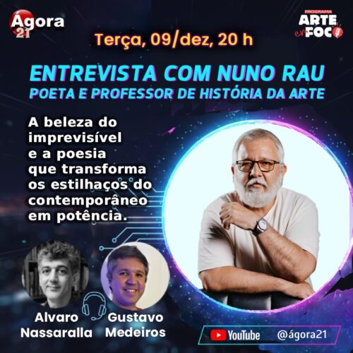– DIA 09 DE DEZEMBRO, ÀS 20h, “ENTREVISTA COM o poeta e professor de História da Arte, NUNO RAU”. Com ALVARO NASSARALLA e GUSTAVO MEDEIROS. Local: YouTube @ágora21. IMPERDÍVEL!