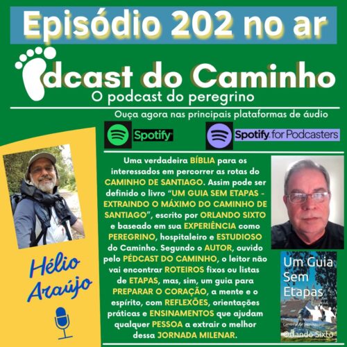 – O excelente jornalista HÉLIO ARAÚJO continua apresentando seu “PÉDCAST DO CAMINHO – O PODCAST DO PEREGRINO”, que fala e ensina tudo sobre o Caminho de Santiago, para quem se interessa pelo assunto. Está no ar o episódio 202, agora, também, no Spotify, no qual o apresentador indica o livro, lançado pela Amazon, UM GUIA SEM ETAPAS – EXTRAINDO O MÁXIMO DO CAMINHO DE SANTIAGO”, de ORLANDO SIXTO, uma verdadeira BÍBLIA para os interessados em fazer o percurso. A conversa entre o jornalista e o escritor está no link a seguir: “PÉDCAST DO CAMINHO – O PODCAST DO PEREGRINO”