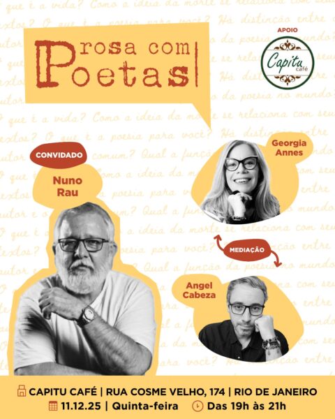 – DIA 11 DE DEZEMBRO, DAS 19h ÀS 21h, “PROSA COM POETAS”, com NUNO RAU. Mediação: GEORGIA ANNES e ANGEL CABEZA. Local: Capitu Café, Rua Cosme Velho, 174. IMPERDÍVEL!
