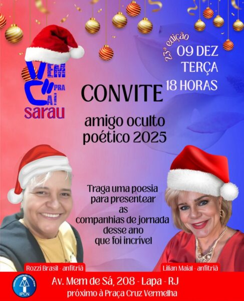 – DIA 09 DE DEZEMBRO, ÀS 18h, “VEM PRA CÁ! SARAU”, com ROZZI BRASIL e LILIAN MAIAL. Na ocasião, haverá um “amigo oculto poético”. Local: IPCN, Av. Mem de Sá, 208, Lapa, próximo à Praça Cruz Vermelha.