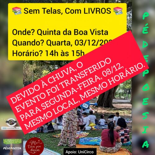 – DIA 08 DE DEZEMBRO, DAS 14h ÀS 15H, “SEM TELAS, COM LIVROS”. Coordenação: ROSE LIMA. Dentro do projeto literário “PÉDEPOESIA”. A atividade proposta é: “1 hora sem celular, com livros nas mãos.” Local: Quinta da Boa Vista, próximo ao UniCirco, São Cristóvão. NÃO FIQUE FORA DESSA!