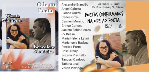 – HOJE, DIA 05 DE DEZEMBRO, ÀS 18h, “ODE AO POETA”: WANDA MONTEIRO / BENEDICTO MONTEIRO. LISTA COMPLETA DE POETAS NO CARD. Local: Sebo Baratos da Ribeiro, Rua 19 de fevereiro, 90, Botafogo. IMPERDÍVEL!