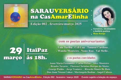 – DIA 29 de março, “SARAUVERSÁRIO na CasAmarElinha”, com curadoria da poeta Rose Araujo, às 18h. Poetas aniversariantes: CELI LUZ, LUÍS TURIBA, NUNO RAU, TANUSSI CARDOSO, VAL MELLO e WANDA MONTEIRO. Poetas Convidados: ALICE MONTEIRO, ANGEL CABEZA, ANNA MARIA FERNANDES, BRÁULIO TAVARES, CARLOS ORFEU, CELI LUZ, DAN JUAN NISSAN COHEN, GEORGE PATIÑO, JORGE VENTURA, MARIANGELA BAZBUZ, RICARDO MUNIZ DE RUIZ e THEREZA CHRISTINA ROCQUE DA MOTTA. Evento sujeito à lotação do espaço.