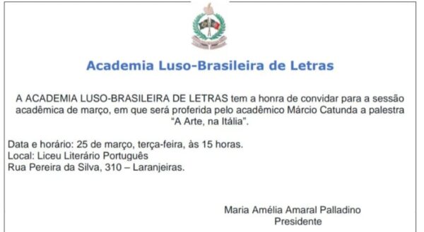 – Dia 25/03 , terça-feira, às 15 horas, a ACADEMIA LUSO-BRASILEIRA DE LETRAS terá a sessão acadêmica de março proferida pelo acadêmico Márcio Catunda com a palestra “A Arte, na Itália”. Local: Liceu Literário Português Rua Pereira da Silva, 310 — Laranjeiras.