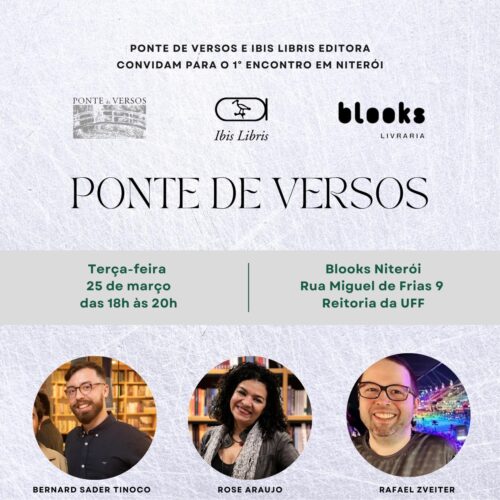 – DIA 25 de março, das 18h às 20h, “PONTE DE VERSOS”, curadoria de Thereza Christina Rocque da Motta, com BERNARD SADER TINOCO, ROSE ARAUJO e RAFAEL ZVEITER. Local: Blooks Niterói, Rua Miguel de Frias, 9, Reitoria da UFF.