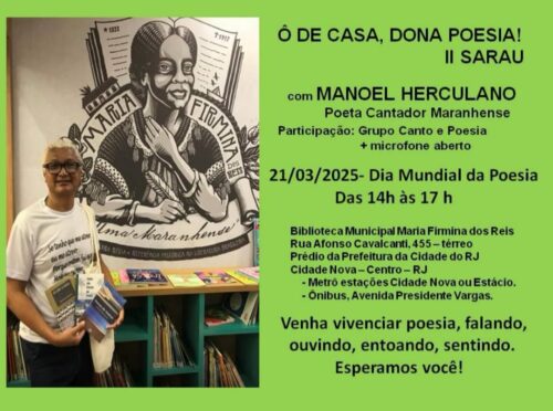 – HOJE, dia 21 de março, das 14h às 17h, “Ô DE CASA, DONA POESIA! II SARAU”, com o poeta MANOEL HERCULANO e participação do GRUPO CANTO E POESIA + microfone aberto. Local: Biblioteca Municipal Maria Firmina dos Reis, Rua Afonso Cavalcanti, 455 – térreo, Prédio da Prefeitura da Cidade do RJ, Cidade Nova, Centro.