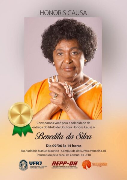 – DIA 09 DE JUNHO, ÀS 14h, BENEDITA DA SILVA receberá o título de DOUTORA HONORIS CAUSA pela UFRJ. Local: Auditório Manuel Maurício, Campus da UFRJ, Praia Vermelha.