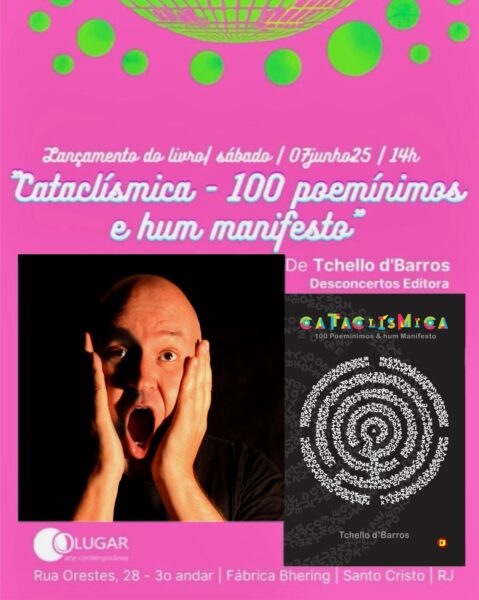 – AMANHÃ, SÁBADO, DIA 07 DE JUNHO, ÀS 14h, “CATACLÍSMICA”, de TCHELLO d’ BARROS, com performances da TRUPE DI VERSOS, e os poetas ANGEL CABEZA, DEI RIBAS, GABRIEL MARTINS, IVERSON CARNEIRO, MARIA DO CARMO PROCACI e VAL MELLO, contando com os atores ALEXANDRE LAMBERT e KATIA YUNES, além de outras ótimas atrações. Local: Galeria OLUGAR – Fábrica Bhering, Rua Orestes, 28, 3º andar, Santo Cristo. Entrada livre.