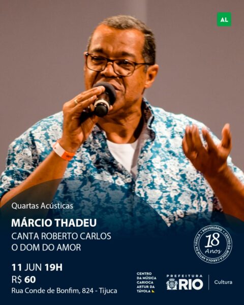 – DIA 11 DE JUNHO, ÀS 19h, “MÁRCIO THADEU CANTA ROBERTO CARLOS – O DOM DO AMOR”. Local: Centro da Música Carioca Artur da Távola, Rua Conde de Bonfim, 824, Tijuca. R$ 60,00.  IMPERDÍVEL!!!