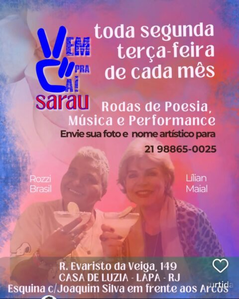 – DIA 10 DE JUNHO, ÀS 18H, VEM PRA CÁ! SARAU”, organização de ROZZI BRASIL e LILIAN MAIAL, com rodas de poesia, música e performance. Local: Casa de Luzia, Rua Evaristo da Veiga, 149, Lapa, esquina com Joaquim Silva, em frente aos Arcos.