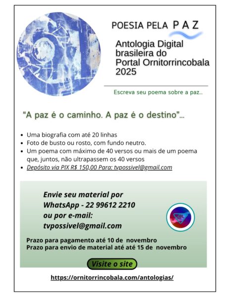 – ATÉ AMANHÃ, DIA 15 DE NOVEMBRO estarão abertas as inscrições para envio de material para a “ANTOLOGIA DIGITAL BRASILEIRA DO PORTAL ORNITORRINCOBALA 2025 – POESIA PELA PAZ”. DETALHES NO POSTER: