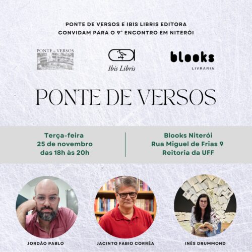 – DIA 25 DE NOVEMBRO, DAS 18h ÀS 20h, “PONTE DE VERSOS”, com JORDÃO PAULO, JACINTO FABIO CORRÊA e INÊS DRUMMOND. Local: Blooks Niterói, Rua Miguel de Frias, 9, Reitoria da UFF.