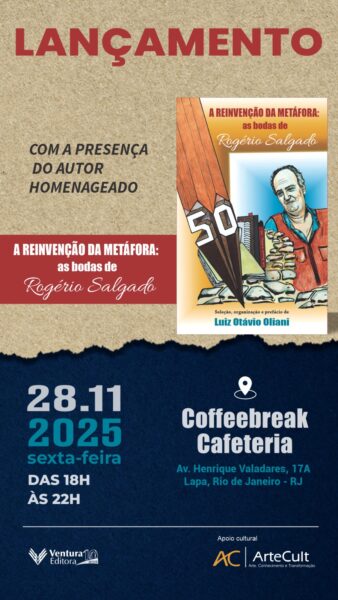 – DIA 28 DE NOVEMBRO, DAS 18h ÀS 22h, “A REINVENÇÃO DA METÁFORA: AS BODAS DE ROGÉRIO SALGADO”. Seleção, organização e prefácio de LUIZ OTÁVIO OLIANI. Local: Cofeebreak Cafeteria, Av. Henrique Valadares, 17ª, Lapa.
