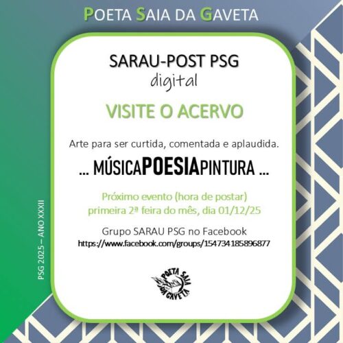 – DIA 01 DE DEZEMBRO, “POETA SAIA DA GAVETA” – SARAU-POST PSG DIGITAL”. Música, poesia, pintura…ENVIE SEU TRABALHO PARA O LINK DO POSTER.