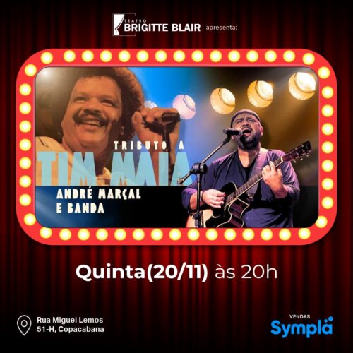 – DIA 20 DE NOVEMBRO, ÀS 20h, “TRIBUTO A TIM MAIA”, com ANDRÉ MARÇAL e Banda. Vendas Sympla, no link descrito. Local: Teatro Brigitte Blair, Rua Miguel Lemos, 51-H, Copacabana. TODOS LÁ!