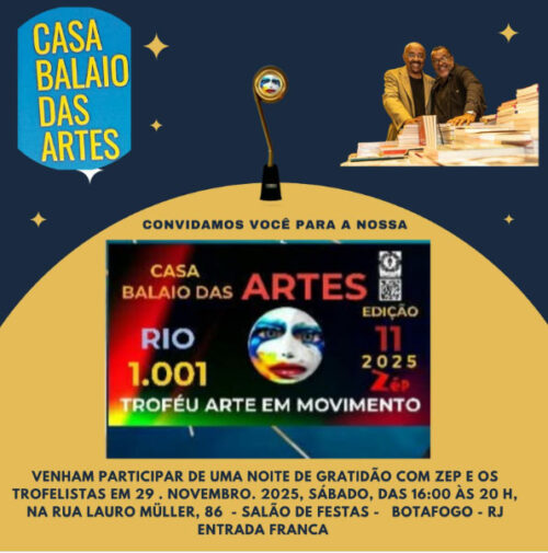 será realizada a premiação do “TROFÉU ARTE EM MOVIMENTO”, de JOSÉ PEREIRA DE SOUZA PEREIRA (ZEP), com o apoio da Casa Balaio das Artes (leia-se JUVENAL C. FILHO e MÁRCIO THADEU). Local: Rua Lauro Müller, 86, salão de festas, Botafogo. Entrada franca.