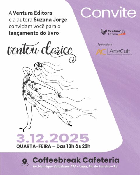 – DIA 03 DE DEZEMBRO, DAS 18h ÀS 22h, “VENTOU CLARICE”, de SUZANA JORGE. Local: Coffeebreak Cafeteria, Av. Henrique Valadares 17ª, Lapa. TODOS LÁ!