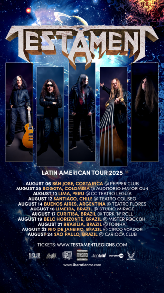 Titã absoluto do thrash metal mundial, o Testament está de volta à América Latina com uma turnê arrebatadora marcada para agosto. No Brasil, os fãs poderão conferir a fúria sonora da banda em seis cidades: Limeira (16/08), Curitiba (17/08), Belo Horizonte (19/08), Brasília (21/08), Rio de Janeiro (23/08) e São Paulo (24/08). A realização é da Liberation Music Company, que promete uma experiência inesquecível para os devotos do metal.
