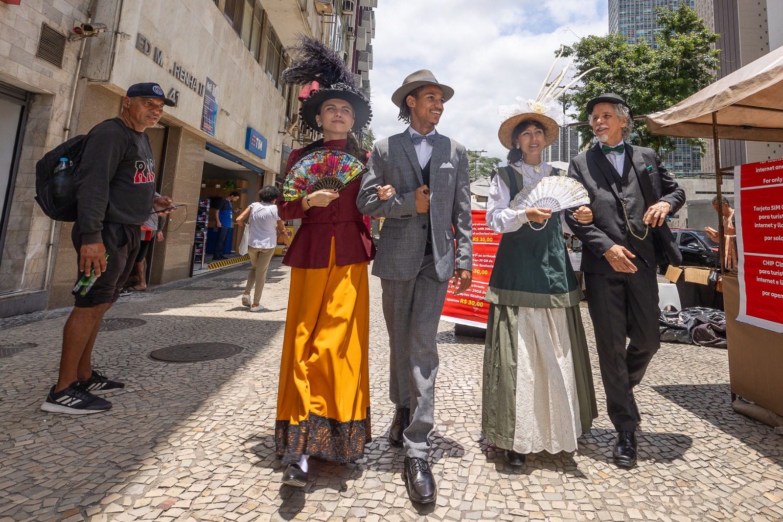 Quando lemos a respeito da Avenida Central ou folheamos o álbum da Avenida Central com as fotos de Marc Ferrez dá muito dó. Como foi permitido destruir tantos prédios desta avenida para subirem os feios arranhas céus que hoje poluem a Avenida Rio Branco? Mas ali na Cinelândia estão de pé os três grandes palácios: A Biblioteca Nacional, o Museu Nacional e o Theatro Municipal então o a localização contribui. Receber os visitantes com figurino de época ajuda bastante para lembrar essa época e os figurinos femininos desenhados por Augusto Pessoa são lindos e amo os grandes chapéus com essas imensas plumas. O resto é texto, música e bons atores em cena. E no roteiro conta com a precioso auxílio da pena de Machado de Assis e outros cronistas da Belle Époque. As palavras criam cenários. Muita coisa eu tirei de trechos de matérias de jornais e até de anúncios.