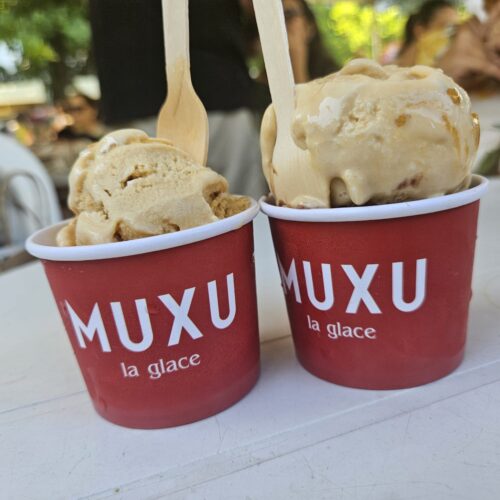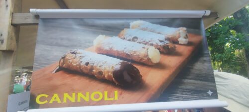 Como contei antes, queria um cannoli tradicional – “sobremesa proveniente da Sicília, que consiste em uma massa doce frita, em formato de tubo, recheada com um creme de ricota” – e um tiramisú – “sobremesa tipicamente italiana, possivelmente originária da cidade de Treviso, na região do Vêneto, e que consiste em camadas de biscoitos de champagne, também chamados de biscoitos tipo inglês ou palitos a la reine (item este que pode ser substituído por pão de ló), embebidas em café expresso (confeiteiros/as profissionais geralmente dão preferência ao uso do café solúvel, por ele ser mais prático e econômico para executar grandes quantidades da receita), entremeadas por um creme à base de queijo mascarpone, creme de leite fresco, ovos, açúcar, e polvilhadas com cacau em pó e café” – mas, depois de enfrentar uma fila enorme em um dos expositores, fui surpreendido com a falta deles, que acabaram muito antes do final do festival. Por sorte, ainda tinha um outro cannoli, com recheio de creme de baunilha…