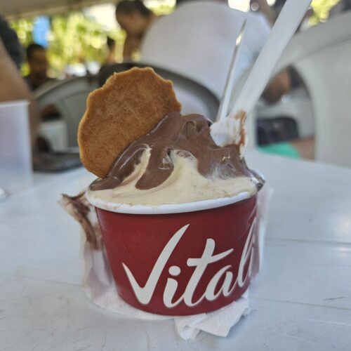 Aí foi a hora das meninas saírem à caça de doces. Embora não ligue muito pra eles, já tinha como certo qual das especialidades italianas iria querer. Acompanhei a saga… Por fim, detiveram-se no gelato – “um sorvete artesanal italiano, denso e cremoso, caracterizado por ter menos gordura, menos ar incorporado e ser servido a temperaturas ligeiramente superiores às do sorvete tradicional“.
