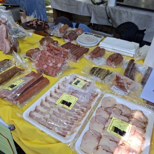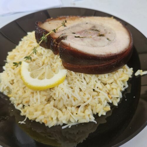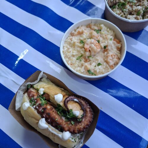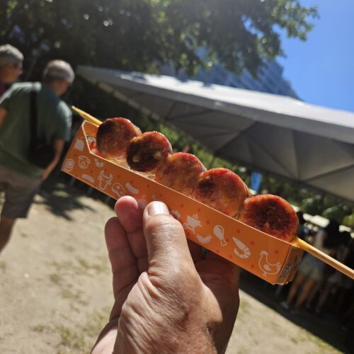 Depois de, à duras penas, conseguir uma mesa, partimos, de imediato, atrás do que comer. Já havia me conformado de que algumas das iguarias que seriam minhas primeiras escolhas estariam inacessíveis e, portanto, já havia estabelecido um plano B – que depois se mostrou C ou D… Mas, enfim, conseguimos um risoto de limão siciliano com porchetta, um nhoque de quatro queijos, um penne com carne e uma pizza de pepperoni. Ah, não sem antes abrir o apetite com uma linguicinha artesanal glaceada com mostarda e mel…