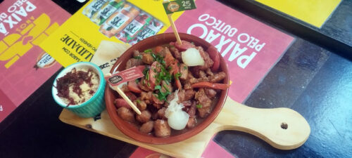 O petisco desse boteco tem o curioso nome de Espeta com o pau e lambe os beiços e traz carne de porco, salsicha e linguiça frita, servidas com um molho especial, acompanhado de uma farofa com crispy de beterraba e molho piri-piri. Segundo a atendente, a gente devia espetar as carnes no palito, passar tudo pela farofa e comer para, depois, lamber os beiços, preparando-os para nova investida.