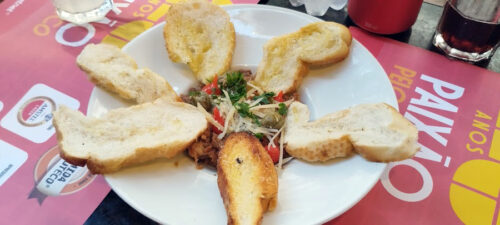 O petisco desse ano foi o Boi Desfiado, uma carne bovina assada macia e suculenta, desfiada, temperada no padrão, servida com torradas no azeite.
