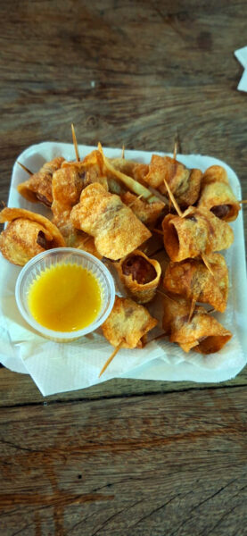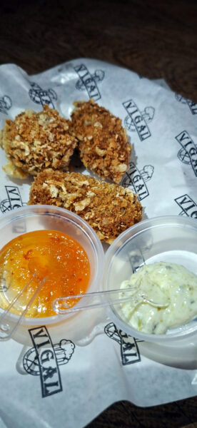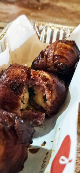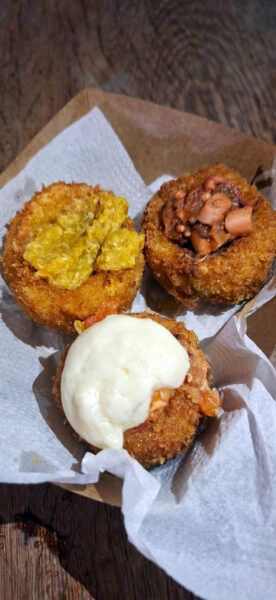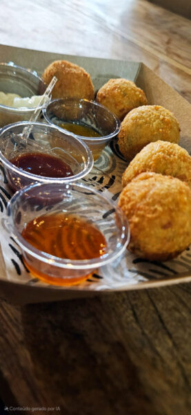 O segundo lugar ficou com o estreante VIGAL BAR (@vigalbar), de Jacarepaguá. Inaugurado em 2023, já conquistou seu espaço, atraindo quem busca petiscos fartos e saborosos, bebida gelada e ambiente familiar. Ele trouxe o “Porquinho na Cuxxtela da Vaca – 3 bolinhos de costela recheados com queijos gorgonzola, coalho e muçarela, empanados em uma deliciosa farinha de torresmo“. Aqui, uma observação: adorei a criatividade do empanamento, que trouxe uma crocância bem saborosa…