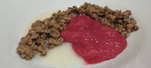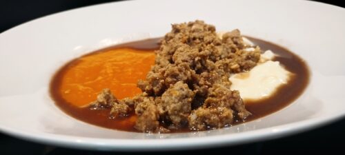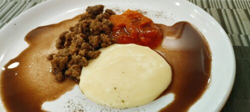 É, realmente,  um novo patamar. Depois de um longo período, que nos parece interminável, podemos mastigar algo e é um verdadeiro delírio! E nós, cozinheiros, ainda podemos brincar um pouco com isso, fazendo algumas montagens para ajudar – afinal, comemos com os olhos também, né? E eu nunca pensei que iria gostar tanto de uma carne moída com purê e caldinho de feijão!