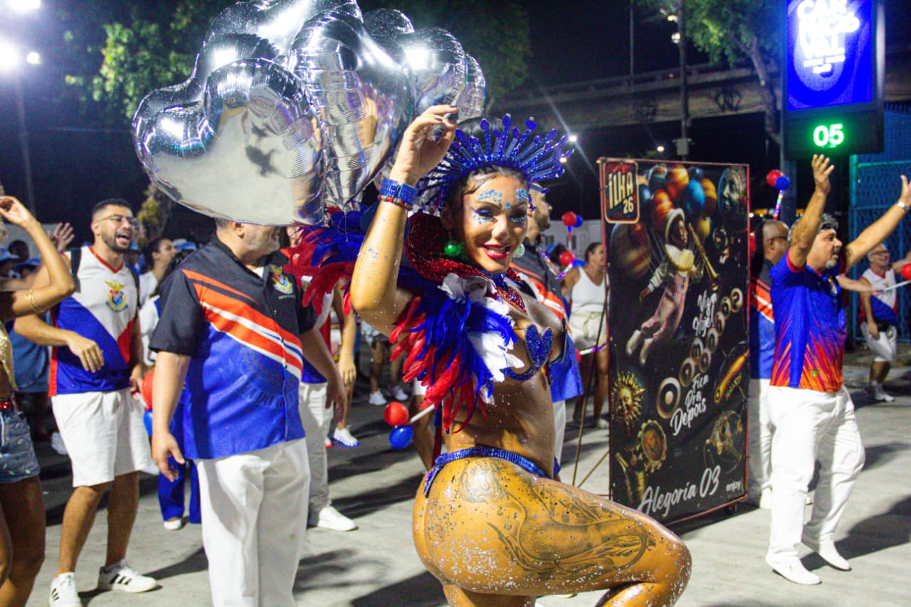 Criativa e alinhada ao enredo, Amanda chamou atenção pelo figurino escolhido para o ensaio. A fantasia, intitulada “Coração Insulano”, trouxe balões de gás hélio em formato de coração e fez referência direta a um verso do samba-enredo da escola, traduzindo em imagem a emoção e a identidade presentes na obra carnavalesca.