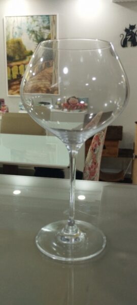 Orientado pelo Renato, preparei todo o esquema: o vinho tinha que estar a uma temperatura de 18ºC e ser servido em uma taça Borgonha. A história da taça Borgonha está ligada à região da Borgonha na França, berço de vinhos complexos como o Pinot Noir. Seu formato de balão, com um bojo amplo, foi projetado para destacar os aromas delicados e complexos desses vinhos. A taça Borgonha é específica para os vinhos mais delicados e aromáticos da região de Borgonha, apesar de a taça Bordeaux ser mais conhecida.
