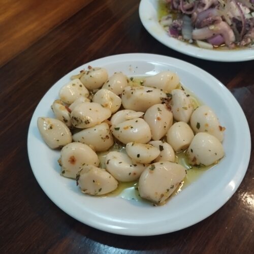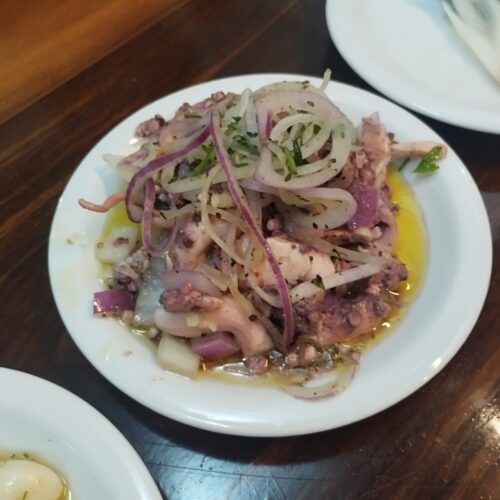 Por fim, o não menos famoso vinagrete de polvo – macio, bem temperado, picante na medida, boa acidez. Com um pãozinho francês pra mergulhar no azeite, fica ainda mais perfeito!