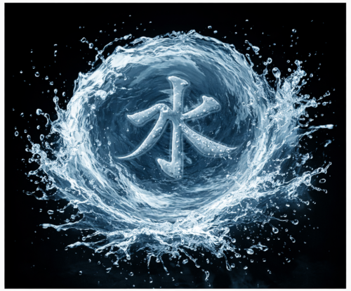 Imagem: redemoinho com ideograma chinês no centro que representa o elemento “água” (shui)